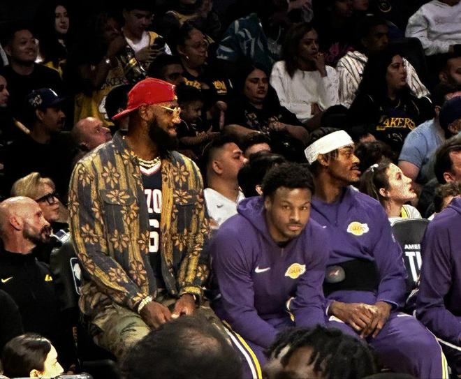 湖人记者分享现场照片,勒布朗出穿着小儿子布莱斯在亚利桑那州立大学的球衣坐在场边观战,大儿子布朗尼坐在他的旁边。