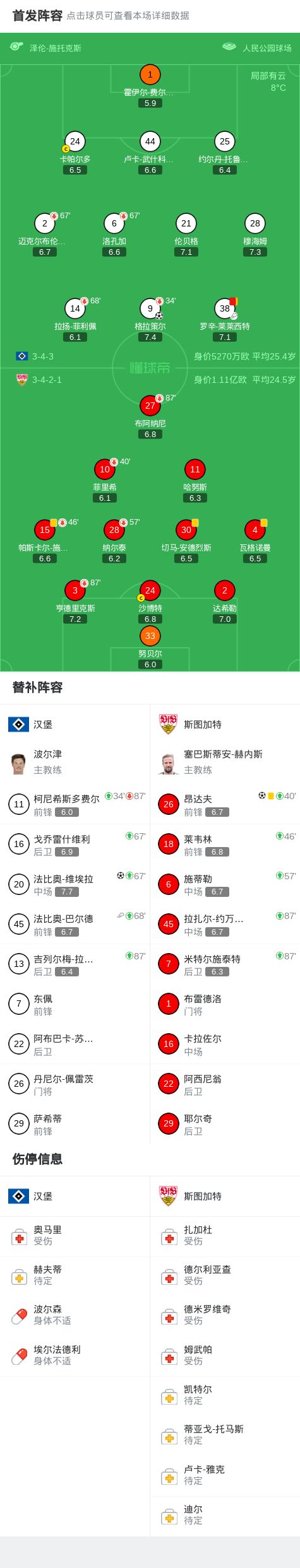 北京时间11月30日德国足球顶级联赛 联赛 第12轮,汉堡主场对阵斯图加特。汉堡格拉策尔破门,法比奥-维埃拉破门。斯图加特昂达夫破门。最终比分汉堡 2-1 斯图加特。